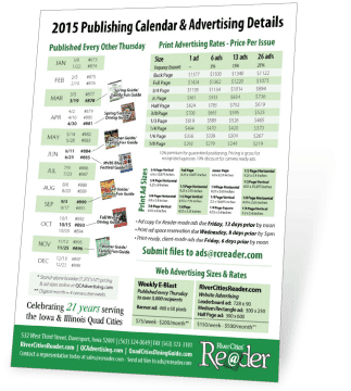 Your resource for all things Reader in the coming year is now available. With our 2015 Publishing Calendar & Ad Details, you can browse our print advertising rates, artwork sizes, web ad info, deadlines, and our complete 2015 calendar, which includes the publishing dates of every Reader, Seasonal Guide, and Dining Guide. This sheet is a handy guide for both new and current advertisers. Never miss a special issue again – stay in the loop with all of the Reader's offerings and download your copy today!